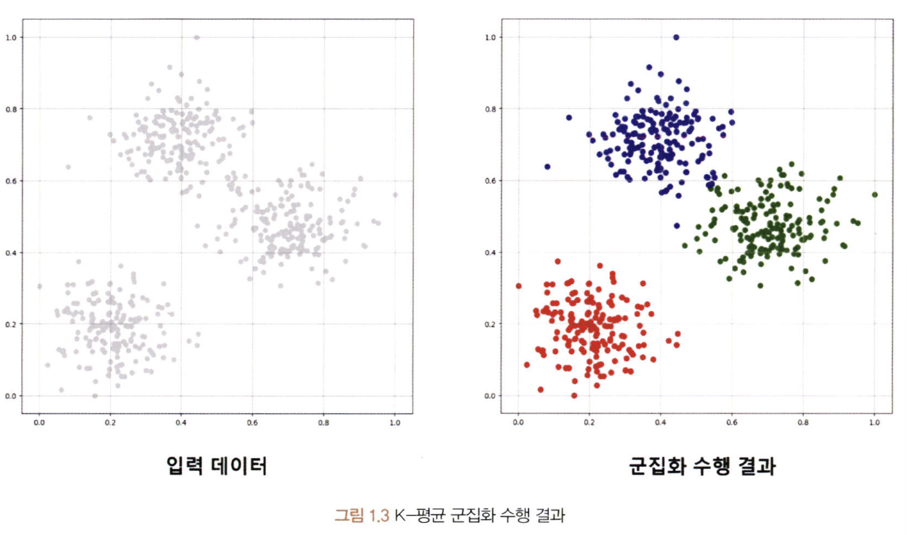 - Clustering(군집화): 입력 데이터를 기준으로 비슷한 데이터끼리 몇개의 군집으로 나누는 알고리즘
