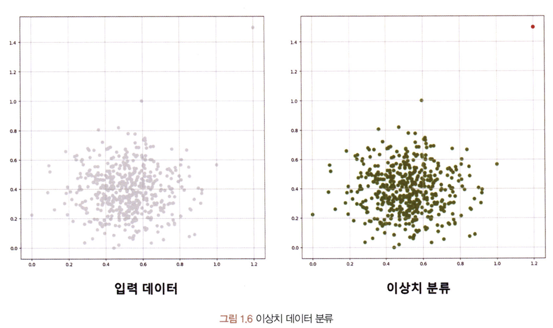 - Outlier Dtection, Anomaly Detection(이상치 탐지): 밀도가 높은 데이터 분포에서 멀리 떨어져 있는 샘플을 찾는 것