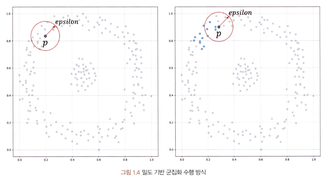 2. DBSCAN: 특정 공간 내에 데이터가 많이 몰려 있는 부분을 대상으로 군집화하는 알고리즘