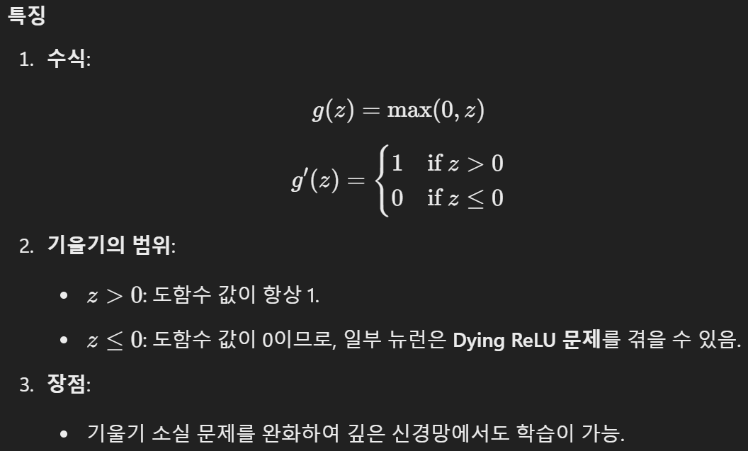 - ReLU: 효율성과 간단함, 음수값 제거