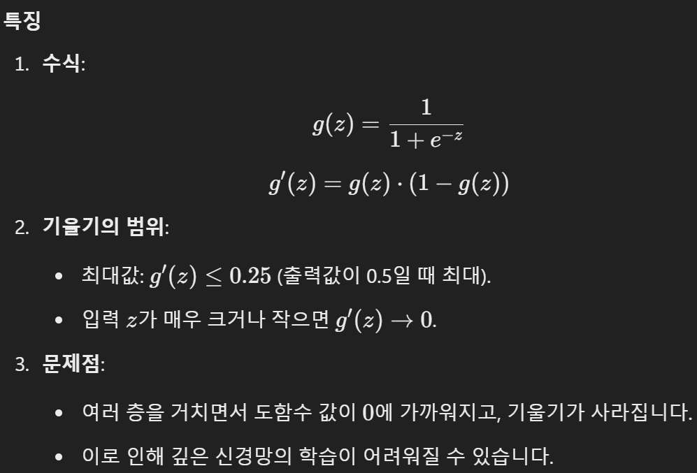 - Sigmoid: 출력값이 확률값을 나타낼 때 사용